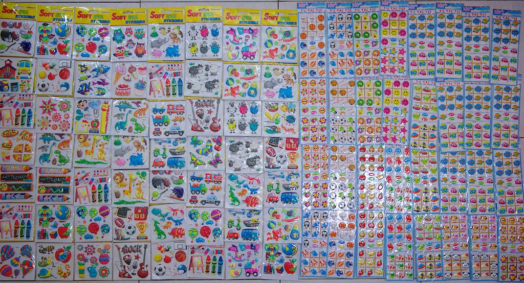 繼去年大手筆一萬五千元的贊助,今年兒童無毒手指顏料UNINK及Color2身體彩繪廠商,又再次提供將近一萬五千元的贊助,包括兩百多張動物、車車、字母、魚類、水果、花草等圖案的魔力多次貼和大張可塗色貼在瓷磚上的造型貼,排在地上滿滿滿的完全排不下去……,到時候每個家庭都會在報到袋裡不挑款的隨機拿到一張(大小依照家庭人數不挑款)。