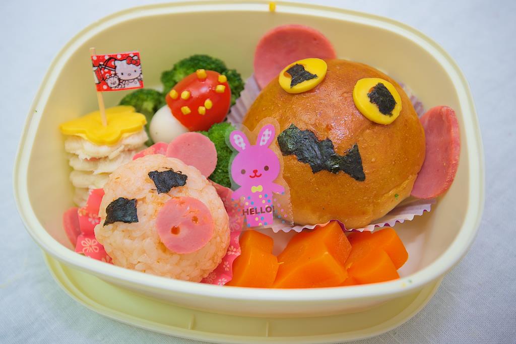 亭亭說這是要做給爸爸吃的,好感動呀,女兒沒有白疼,有漢堡熊、飯團豬、蕃茄蘑菇和國旗迷你土司耶,都是她自己做的喔!