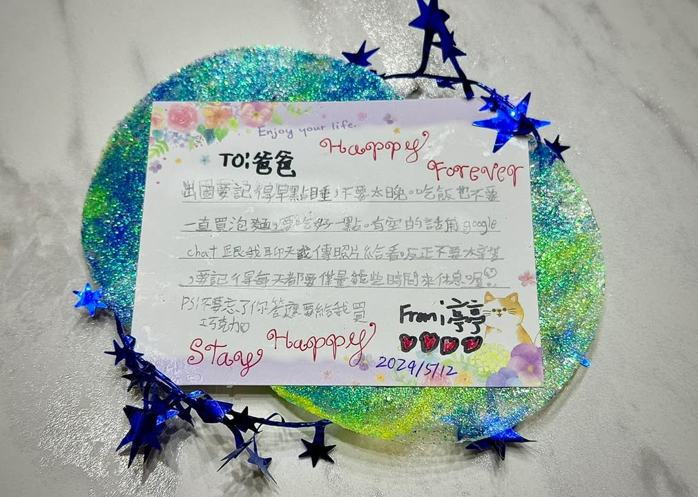 今天凌晨兩點多起來,準備要出發去機場,在行李箱上看到亭亭寫給…