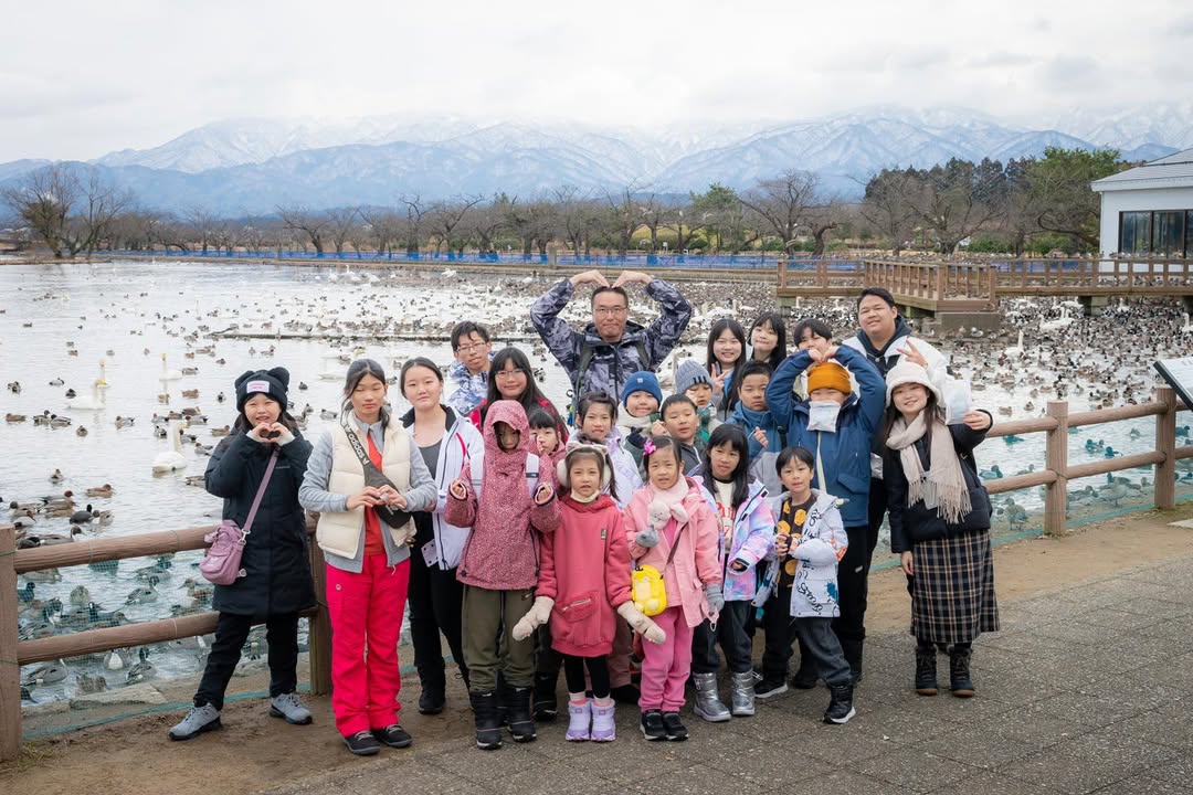 數千隻的白鳥、美麗的湖面和遠方下了雪積雪的群山,這完全就是童話世界才會有的畫面,真實在眼前上演,能跟孩子一起見證,遠道而來太值得了,我跟團員分享:滑雪也是、來這邊看白鳥也是,人生能有這些體驗是跟著孩子一起的,將來都會是最寶貴的回憶。