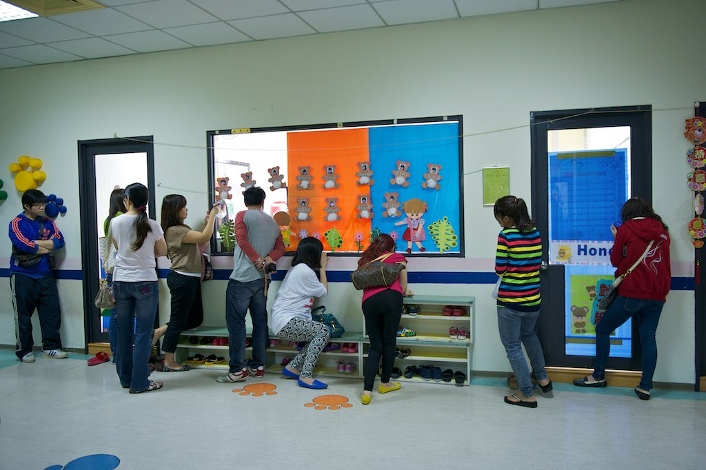 今天是芊芊學校的教學觀摩,雖名為觀摩卻不開放家長進教室,怕會影響小朋友上課,結果外頭就變成這樣,一群急欲從縫隙偷窺的家長,看來我應徵幼兒園警衛的路上遇到了很多對手阿XD