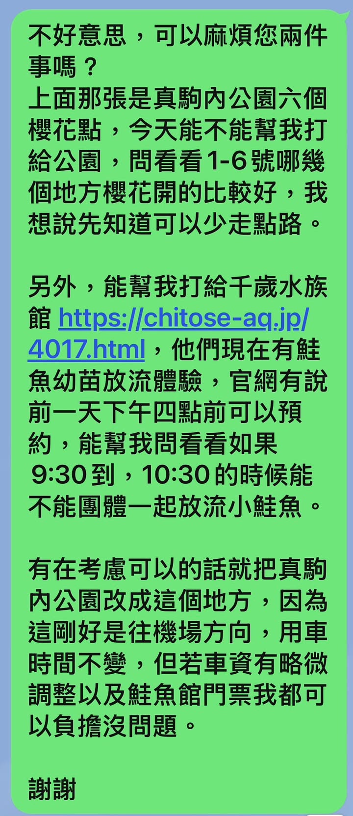 為此前一晚沒睡很好,一早不到六點就開始研究公園的賞櫻點,以及我心中另一個預想的替代點,因為早上還需要帶團的關係,我先把訊息打好讓上班後的日本旅行社替我問,一邊準備著這一天帶團要準備的事物,帶團中因為我有優哥替我分擔,所以我分神幾次講電話,就是在為兩個加碼行程做出抉擇。