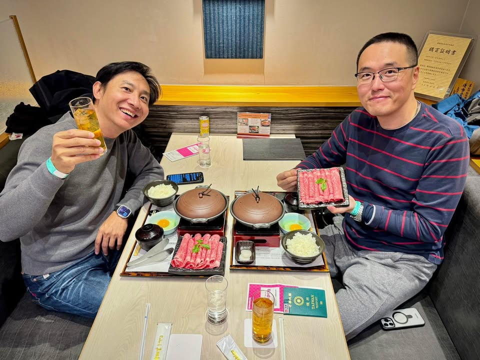 忙碌中也要對自己好一點,旅行中為了求快多點時間做事,常常都隨便吃,今天雲霄飛車樂園陪玩結束後,請也很辛苦的Jeff吃日本三大和牛的松阪牛壽喜燒,部位特別選最好的特級的,不愧是和牛,入口即化超級好吃的,感謝隔壁桌團員媽媽幫拍照 🙂