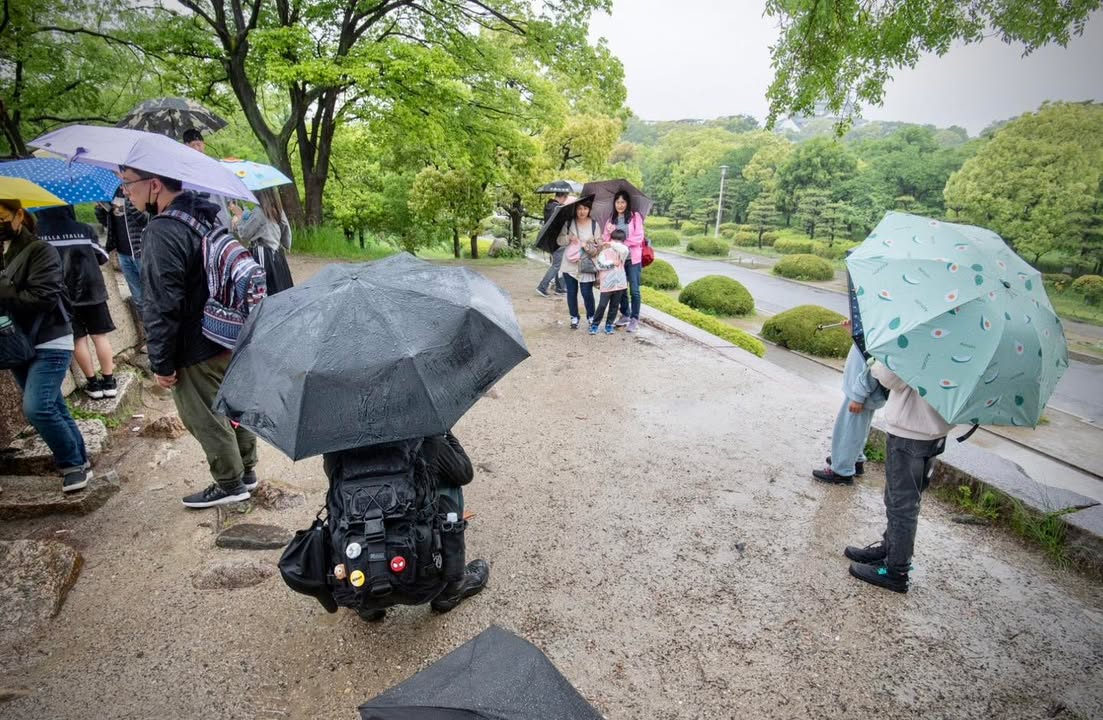 今天來到大阪城公園雖然下雨沒辦法溜滑梯,但我們帶著大家進到離天守閣更近的地方拍照,是的,雨天,撐著傘拿著毛巾擦相機,我們依然照拍,團員都願意了,我們當然沒問題,司機看到我相機濕了還一直問大丈夫ですか。