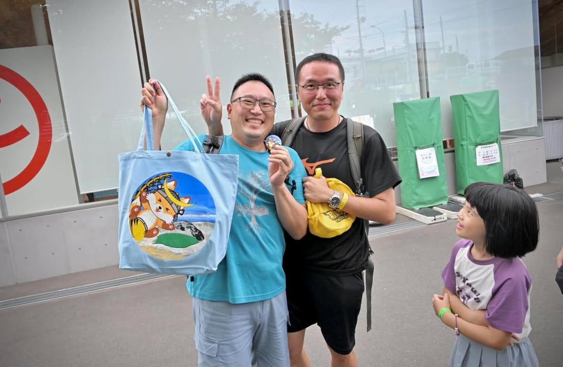 我的團是媽媽詢問報名的比例大概8成以上,但從8年前這位爸爸第一次參加開始的每一次,都是他為全家的旅行報名的,我的印象中,每一次他都比小孩玩得更投入,溜滑梯搶第一、遊樂設施一定玩、連小朋友的小獎品也想要拿一份🤣,有他在團裡的歡樂多了非常多;這一趟也很熱情的為仙台團畫了幾張插畫,其中一個我們將它做成了紀念胸章送給了每一個小朋友,相信爸爸也同樣開心能與大家分享這份喜悅。