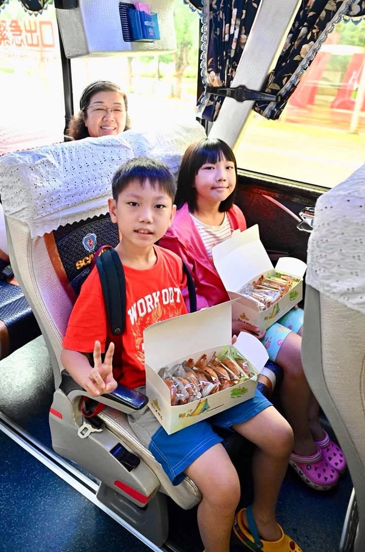 暑假第二圈台灣環島,有我們家芊芊的超級好朋友和小學一直到現在五年級的同學姐弟一起來參加,等於是我們家女兒的分身,第一團環島裡遇到許多芊爸的老團員贈送的伴手禮,這一團當然也有,姐弟第一天一上車就帶來芊爸覺得台中最好吃的「卡但屋公婆餅」和法式千層磚請團員吃(都是她們爸爸親手製作的喲!),太開心了,不愧是台中市十大伴手禮,超好吃的,也為這趟開心的台灣環島之旅揭開甜蜜的序幕 🙂