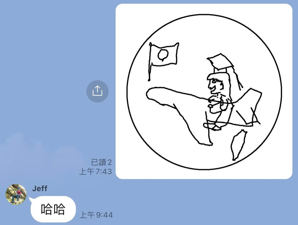 暑假老團員們許願的畢業旅行10天之旅,想要除了迪士尼的胸章外,再看能不能請Jeff畫一個畢旅限定紀念胸章,結果我把小畫家畫的草稿傳給Jeff看,他回了我兩個字: #哈哈