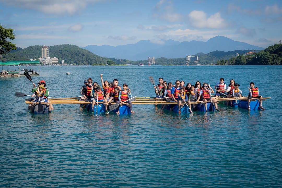 當花費了不少力氣,親子們所一起打造的船下水後,總覺得從岸邊一定拍不到什麼,多半是背影或是人小小的紀錄照居多,所以特別協調了維護大家安全的動力護衛小船,讓Jeff穿著救生衣上去,因為小船機動性較高好移動,這樣就可以由湖面上捕捉好角度的照片,也讓大家帶回去的回憶更加美麗,就如同划船時有人就在身旁拍照一樣。