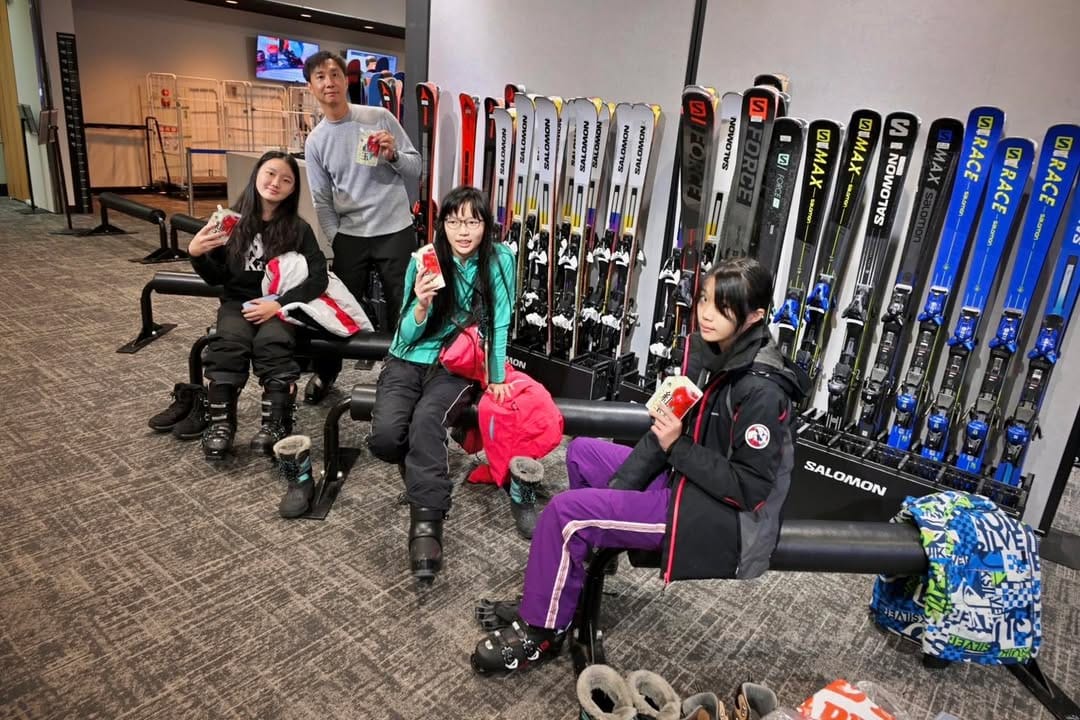滑雪⛷️第一天,準備好小孩們上課過程中可補充體力的青森蘋果飲,芊芊、亭亭、小瑀、Jeff四個小孩一人一包XD