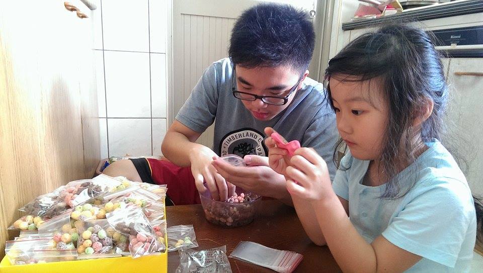 為了星期六日連續兩場的父親節親子活動,連小弟都叫來打工了,從早到晚超過十小時的工,分包裝100多包小材料,不斷的熔巧克力,總共要做超過500顆巧克力,到晚上還做不完,芊媽一直做到晚上七點才吃今天的第一餐飯,太辛苦了,明天還要繼續趕工準備,期待週末的來到 🙂