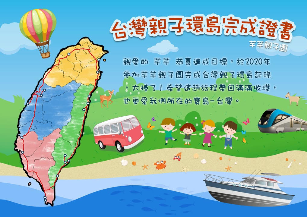 是的,沒錯,以往的每一團國外團我都有頒獎典禮,重點就是讓孩子們完成旅程的時刻得到小小的獎勵,這是旅程中的正向能量,也讓孩子對這趟旅行更加印象深刻,台灣親子環島團不只這樣,我請Jeff為孩子們設計一張環島完成證書,上面標記了我們移動過的路線,每個孩子都會拿到一張可永久珍藏,象徵和爸爸媽媽一起挑戰成功的證明!