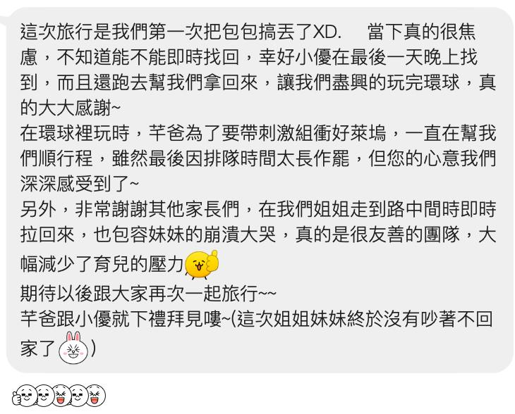 雖然當天馬上回去還是沒能找到包包,因為電車已經開走了,但是站務人員有給我們一張遺失物尋找處理流程表單,所以隔天晚上環球影城陪玩拍照結束後,我讓小優先行離園搭電車過去,我和來支援的Jeff繼續留在樂園內,後來小優也順利的找到包包交還給遺失的家庭。