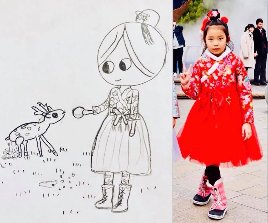 還記得大年初一小瑀穿著新年大紅衣服去餵鹿,結果今天隨手一畫就…