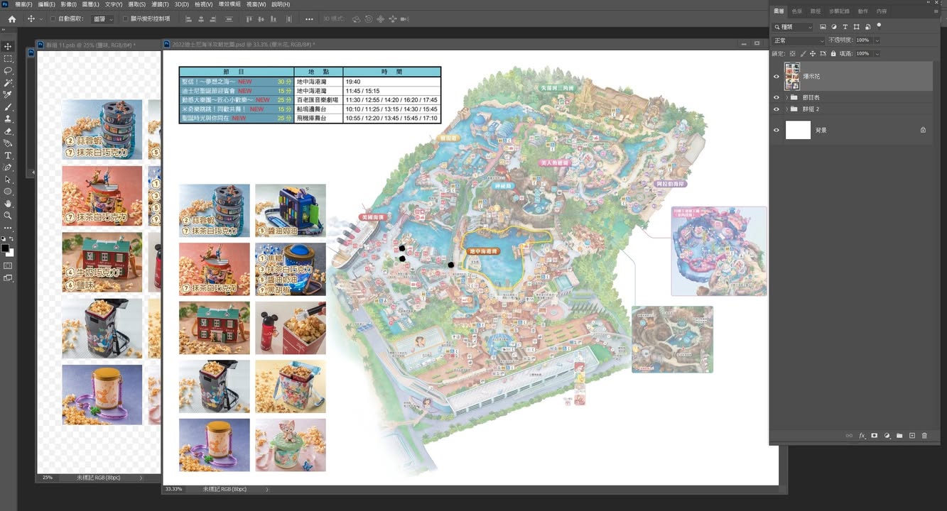 雖然是自己花錢去的,而不是帶團,但還是非常慎重的為了這一趟勘查做了園區內的專屬攻略地圖,很多都是官方地圖沒有的情報,包括表演時間、各爆米花桶位置及各攤位販賣口味,當然還有標出點餐有附限定餐具的餐廳、有提供兒童餐的餐廳、有轉蛋機的地方。